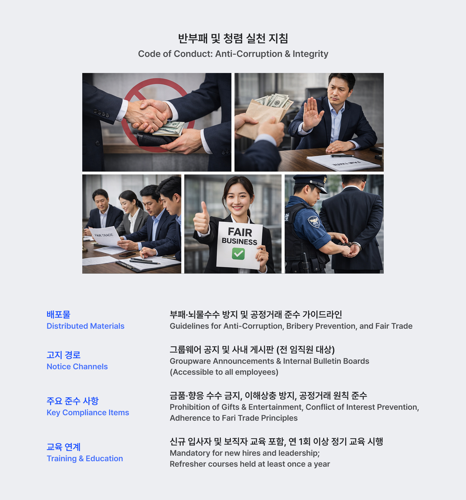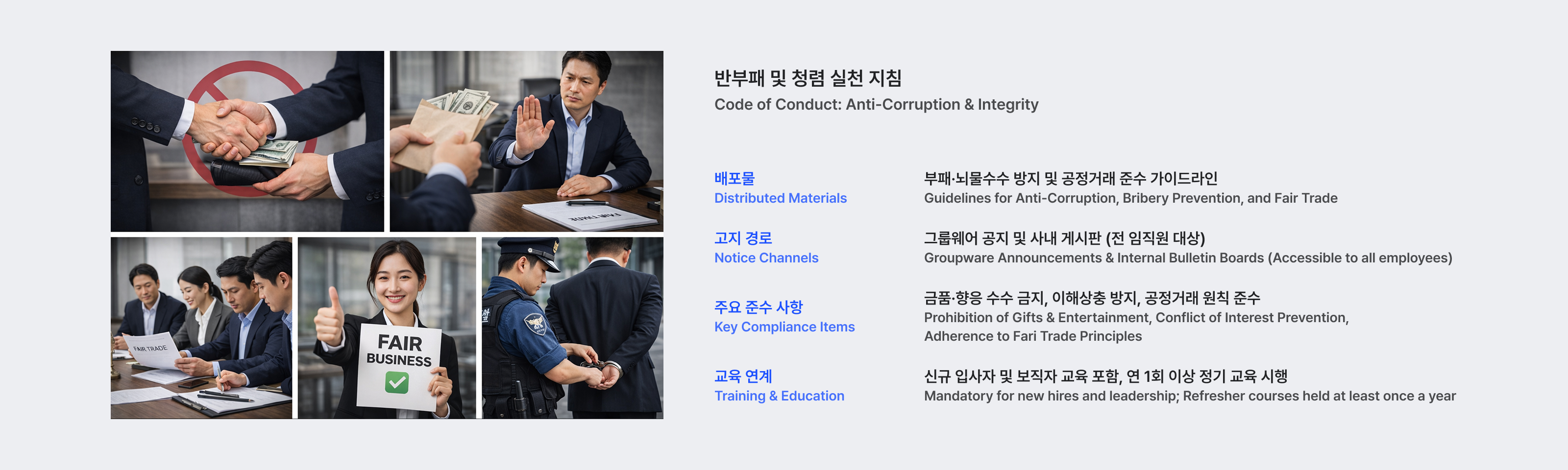 IJS는 전 임직원을 대상으로 부패 및 뇌물수수 방지 지침과 공정거래 가이드라인을 배포하고, 그룹웨어 공지를 통해 준수 사항을 상시 안내합니다. 위반 발생 시 내부 제보 채널을 통해 신고할 수 있으며, 관련 지침은 신규 입사자 및 보직자 교육 과정에 포함되어 정기적으로 재안내됩니다.